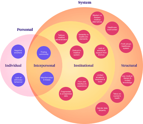 To synthesize our research findings, we gathered and grouped all the problems we found, then mapped how they connect within the healthcare system. We categorized and organized problems based on their scale of control: