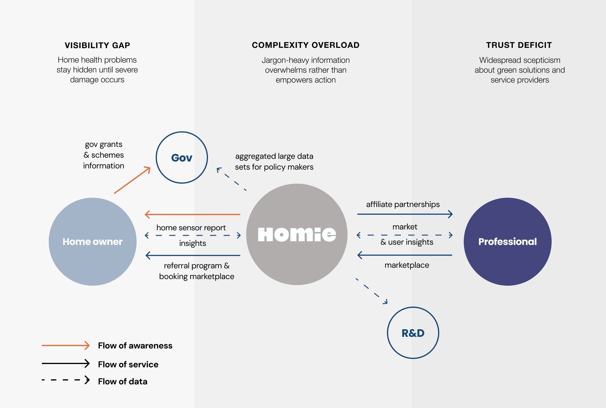 Homie transforms invisible home health problems into visible, actionable insights through an integrated diagnostic sensor kit and connected app ecosystem. The solution works across three strategic levels: